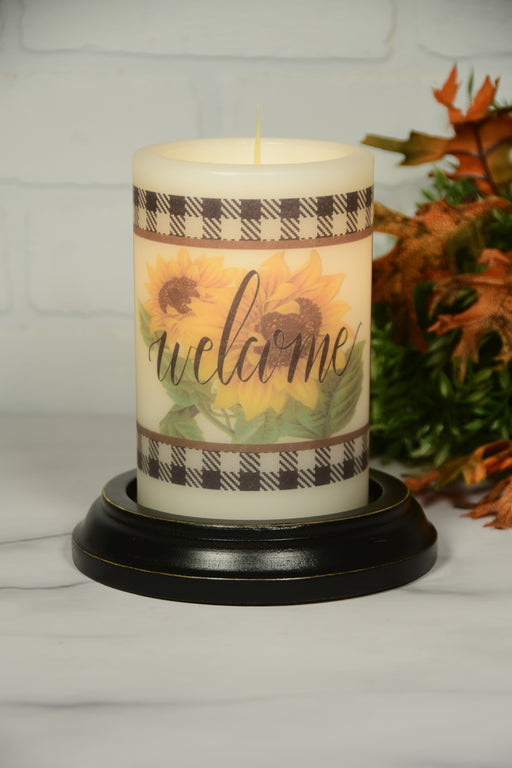 CR DesignsBlack and white buffalo check frame out a welcome greeting and blooms of sunflowers. Different finish options available (Vanilla shown) 6" Tall cy...